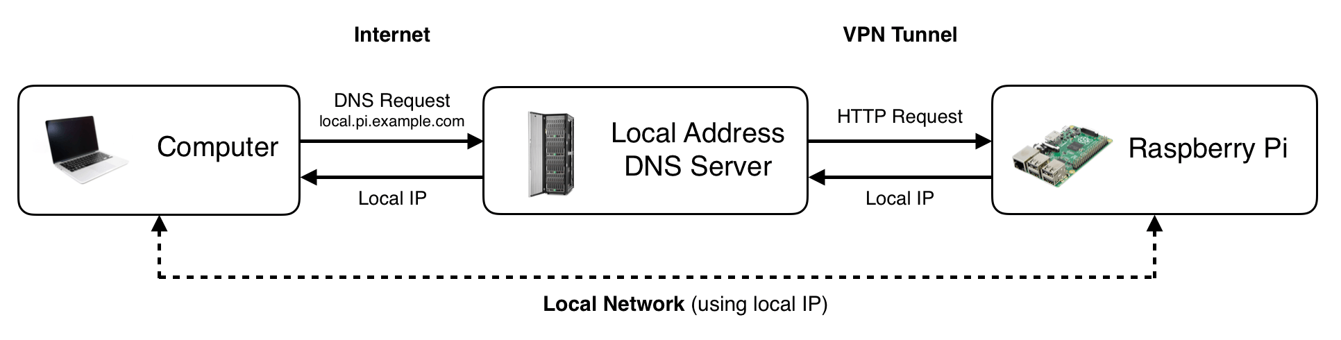 The DNS server that runs on my VPS server is something I created called local-address-dns. This runs a DNS server using dnsd and upon an incoming DNS request it connects to local-address-dns-client-rpi running on my Pi. local-address-dns-client-rpi is a simple web server that returns the Pi’s IP address on one of it’s network interfaces. An NS record on my domain points addresses like local.pi.crawford.kiwi to my VPS to be handled by local-address-dns.
